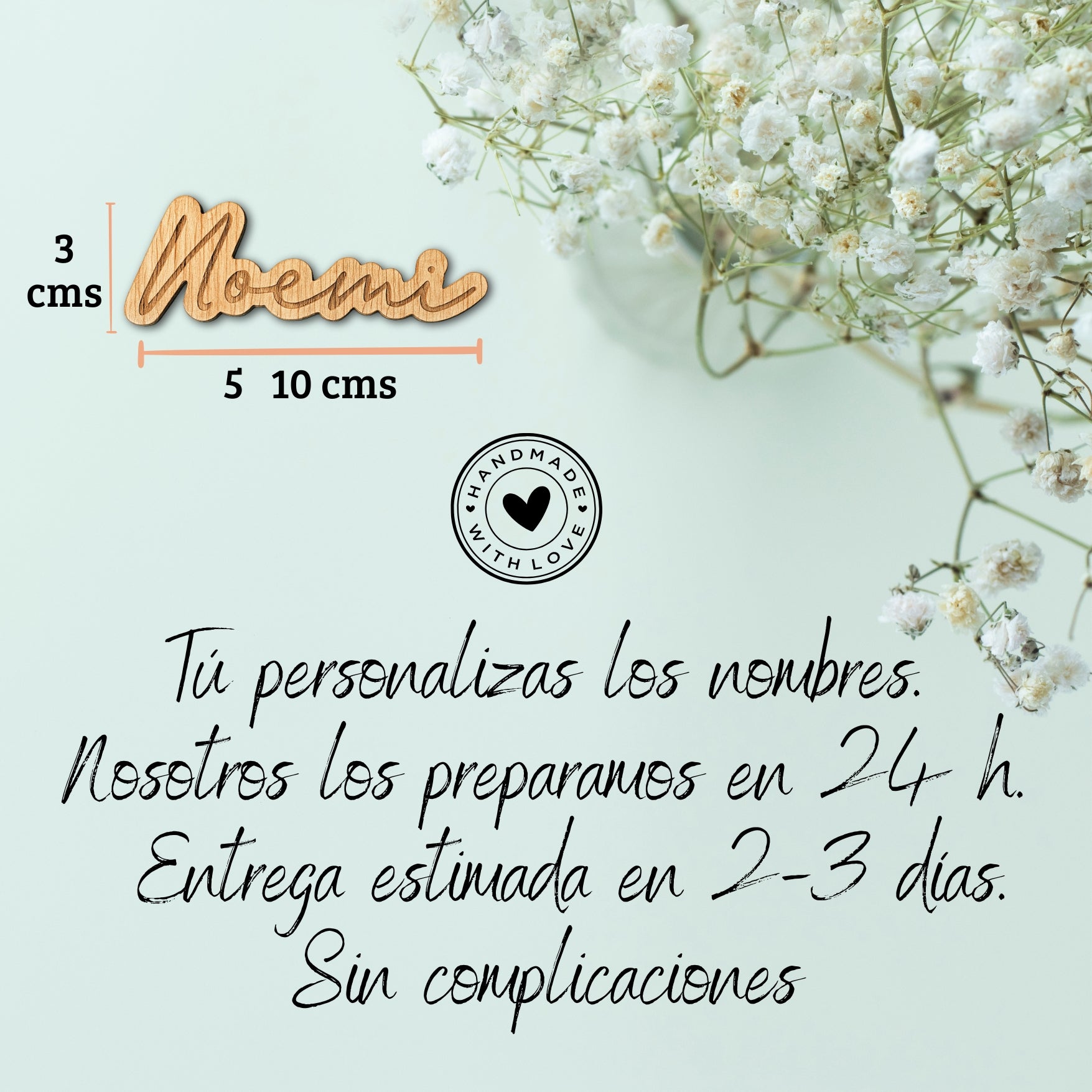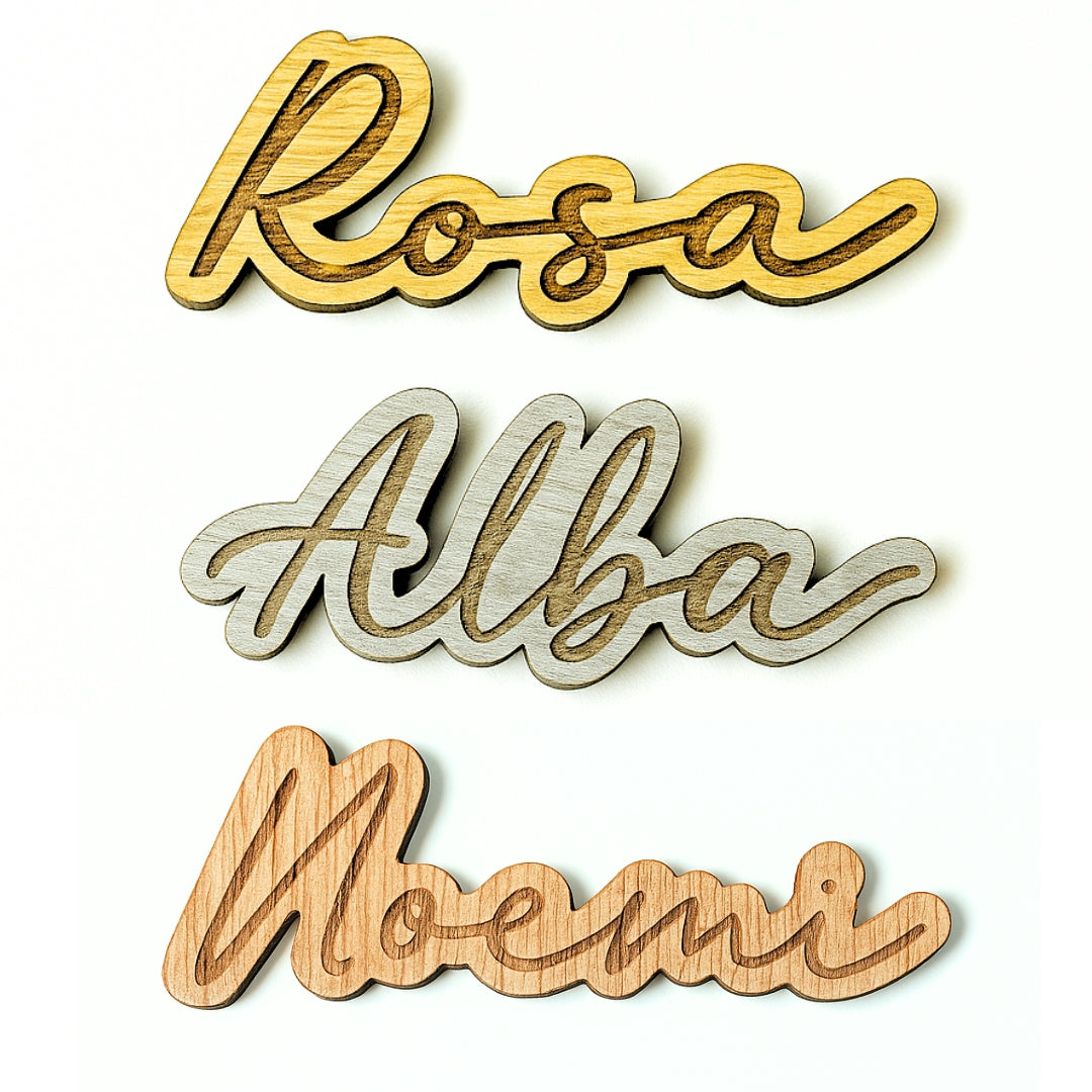 Disponibles en tres colores elegantes (natural, oro y plata) pintados con pinturas ecológicas, puedes personalizarlos totalmente eligiendo entre tres tipografías distintas. El grabado se realiza con tecnología de láser, lo que garantiza una marca permanente en la madera que durará para siempre.