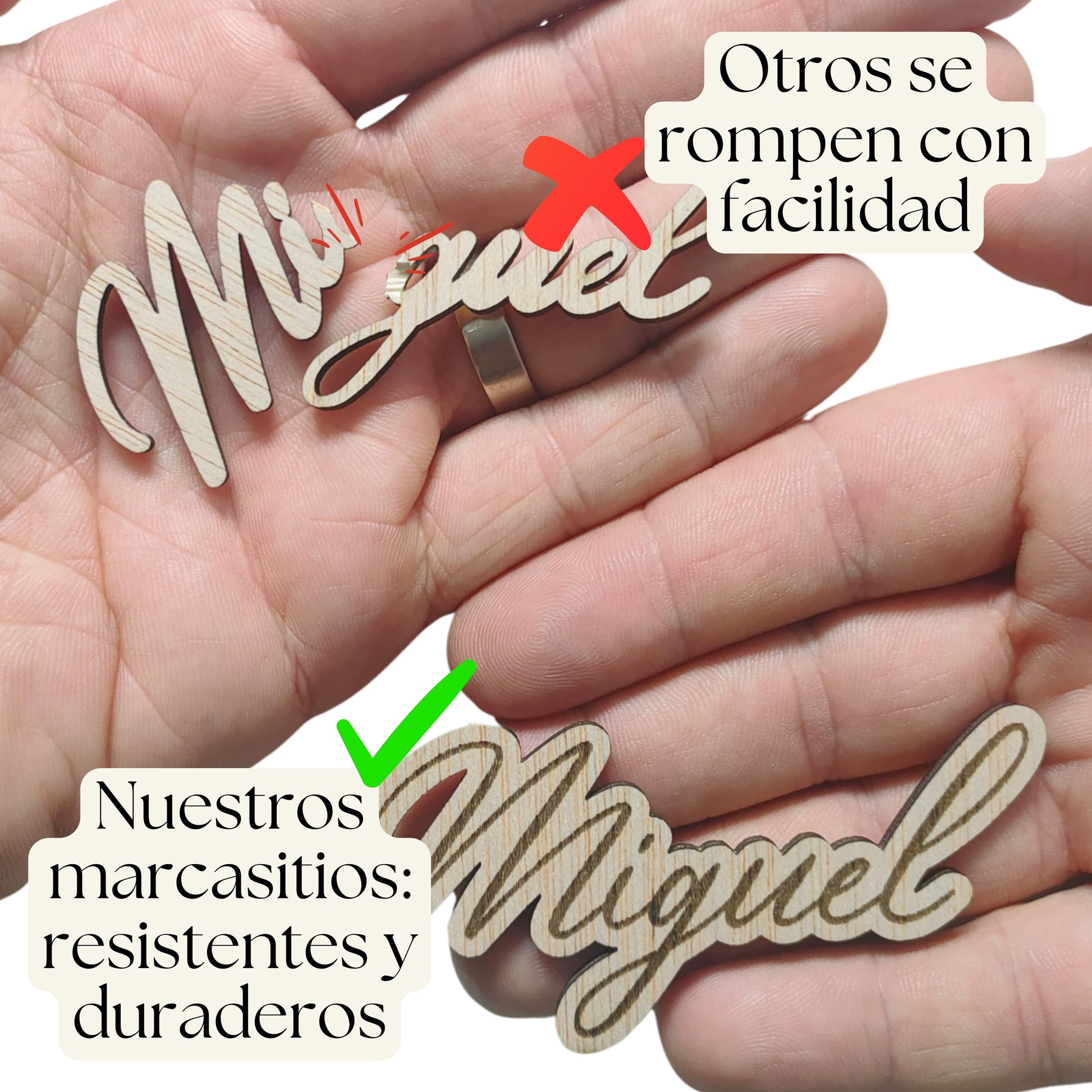 Personaliza tus eventos con nuestros exclusivos marcasitios de madera natural. Hechos de madera sostenible y diseñados para dar un toque único y especial a bodas, comuniones, bautizos y cualquier celebración. Cada marcasitio tiene una altura de 3 cm, y su longitud se adapta al nombre grabado, logrando que sean perfectos para identificar a tus invitados.